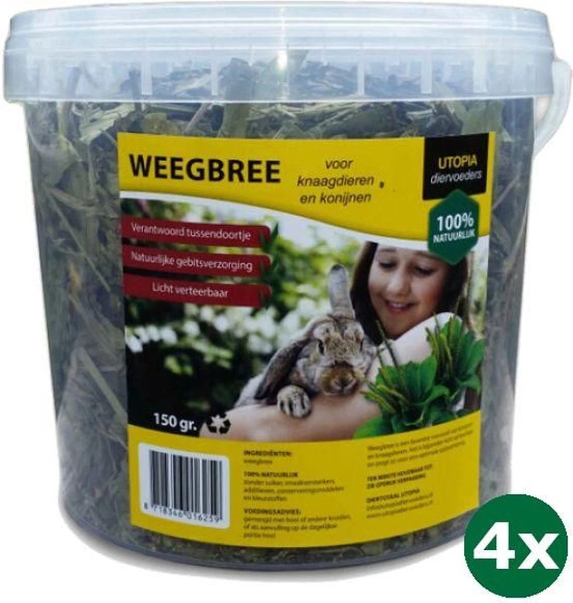 Weegbree 150 gWeegbree is een favoriete ruwvezel van konijnen en knaagdieren. Het is bijzonder licht verteerbaar en zorgt zo voor een optimale spijsvertering. Weegbree is zeer rijk aan vitamine C, heeft een hoog voedingsgehalte en is diarree remmend.Deze plant werkt verzachtend en vermindert de neiging om te hoesten. Daarnaast remt het de ontwikkeling van ziektekiemen sterk af. Het werkt ontstekingswerend en als anti-allergisch middel op de luchtwegen.Inhoud: 150 gSamenstelling:100% weegbreeAnalytische bestanddelen: ruw eiwit 13,7%, ruwe celstof 20,8%, ruw vet 2,4%, ruwe as 12,7%Voedingsadvies: Als aanvulling op de dagelijkse voedingInhoud: 150gr