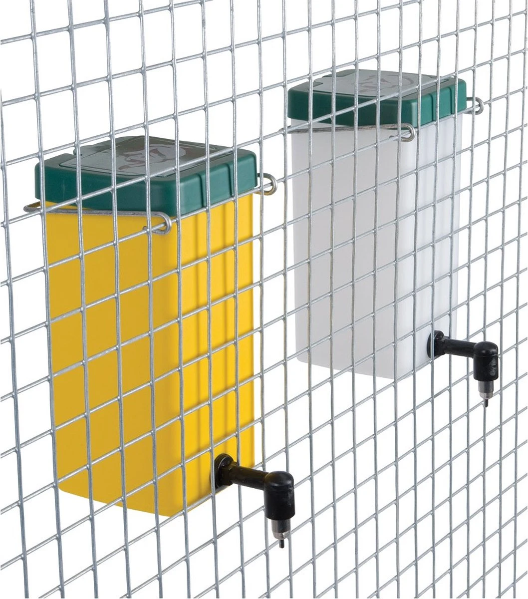 Deze fles is gemaakt van kunststof (pp) en de nippelhouder van een zeer sterk kunststof. de rvs nippel die hierin gedraaid is heeft een zeer lange levensduur. Lekkage kan eigenlijk niet voorkomen maar mocht dit toch gebeuren dan is het in 99% van alle gevallen vervuiling van de nippel. Schoonmaken met bijv. azijn werkt dan perfect. De fles heeft een vierkante deksel die afneembaar is om de fles te reinigen. Op deze deksel zit een ronde witte vulschuif of klapdeksel, deze wordt gebruikt voor het vullen van de fles. De fles word geleverd incl. een verzinkte beugel voor het vastzetten van de fles aan het gaas.