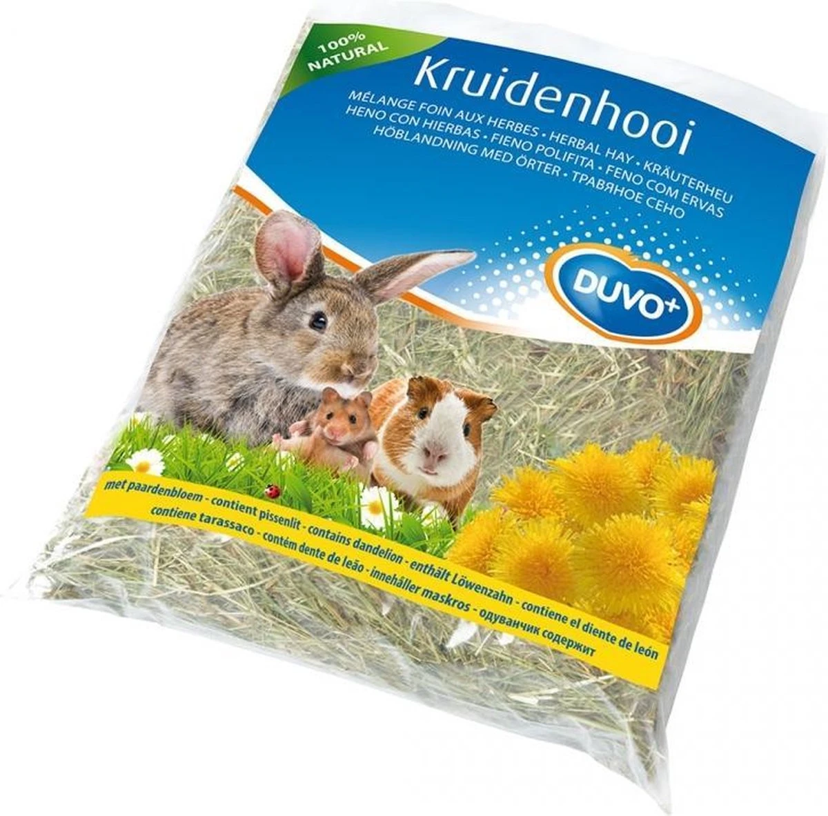 Kruidenhooi van duvo+ is een natuurlijk hooisoort met paardenbloem. Deze variant bevat paardenbloem. Hooi is de basis van het dagelijks rantsoen van uw konijn of knaagdier en moet dus van goede kwaliteit zijn. Hooi bevat zeer veel vezels en andere belangrijke voedingsstoffen die een knaagdier nodig heeft en zorgt hierdoor voor een goede darmflora. Verder is hooi onmisbaar om het gebit van uw konijn of knaagdier op natuurlijke wijze te laten slijten. Dit voorkomt haken aan de kiezen en voortanden.
