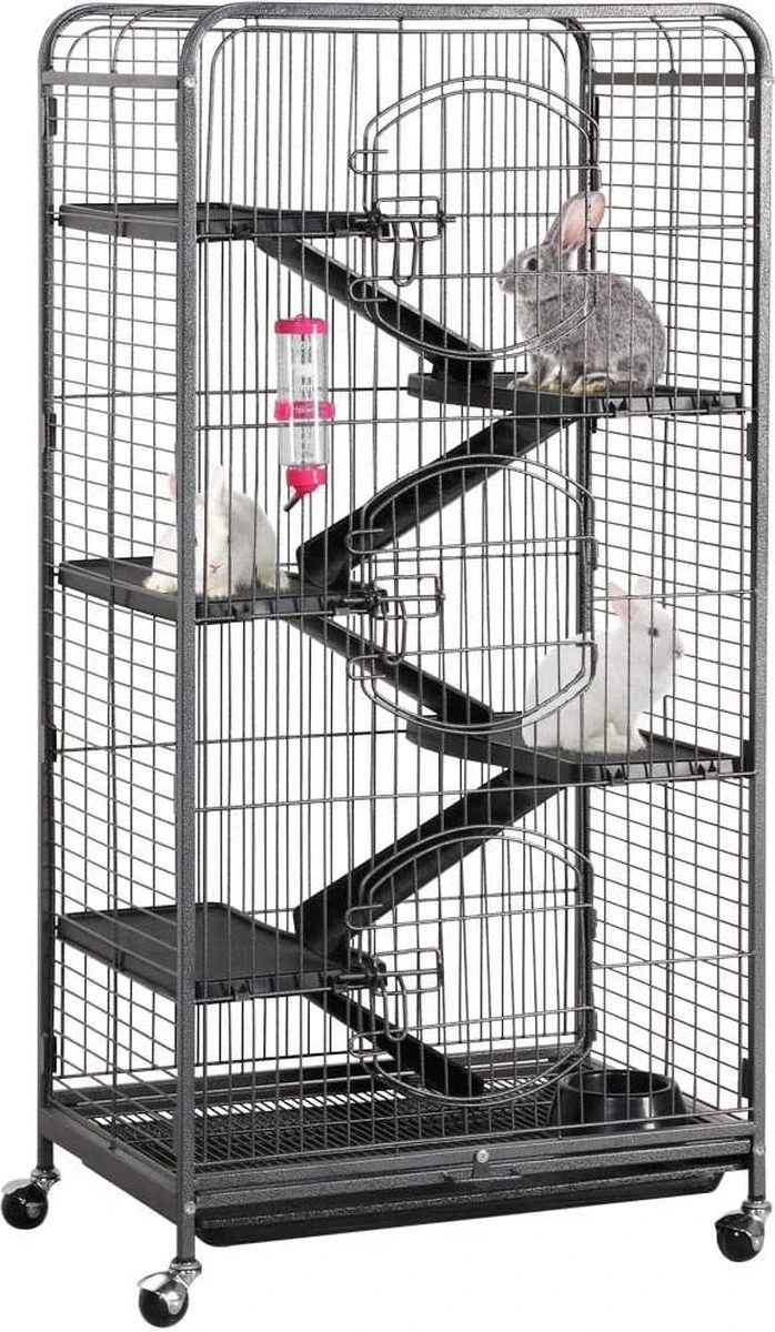- Mobiel en gemakkelijk toegankelijk: dankzij de aan de onderkant van de kooi aangebrachte wielen is de kooi mobiel en kan hij gemakkelijk naar eigen wens worden verplaatst. Dankzij de op 3 verdiepingen aangebrachte deurtjes kunnen de knaagdieren er comfortabel en eenvoudig op elk niveau van het hok worden uitgetild of ingezet.