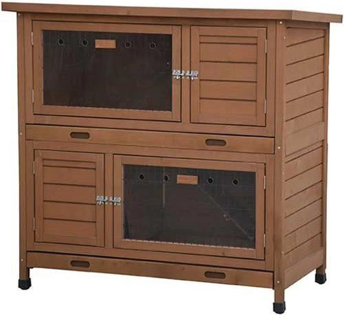 Dit solide dubbele konijnenhok (116x65x113cm) bestaat uit twee verdiepingen die met elkaar verbonden zijn met een trap. Deze trap kan ook afgesloten worden, op deze manier kan je zelf bepalen of de konijnen bij elkaar kunnen. Tijdens koude periodes heeft dit hok niet alleen dubbele wanden maar ook plexi-glas voorzetramen voor extra beschutting. Ook hebben beide verdiepingen een uitneembare schuiflade wat het schoonmaken makkelijk maakt. Ook kunnen alle deurtjes helemaal open. Het hok heeft kunststof potjes en een bitumen dak.Belangrijk: Dit hok is behandeld voorgebruik buiten. Desondanks dien je het hok nog een keer extra te beitsen aan debuitenkant. Hiermee verlaag je het risico op eventuele schimmelvorming of rot,en blijft de kleur van het hok mooier egaal en beter behouden. Hiervoor wordteen transparante beits op waterbasis geadviseerd. Beits het hok absoluut nietaan de binnenkant, dit kan de gezondheid van je konijn in gevaar brengen.Let op: je ontvangt dit hok alsbouwpakket, geleverd met voorgeboorde panelen, schroevenset en bouwtekening.Houd bij de aanschaf en plaatsing vanhet hok rekening met de volgende punten:Houdt rekening met de grootte van de konijnen en het aantal konijnen tijdens de aanschaf van een hok. Een konijn moet alles kunnen doen wat het normaal ook zou doen (recht op staan, rennen, springen, uitrekken).Het nachthok dient beschut en donker te zijn zodat het konijn een comfortabele en veilige slaapplek heeft.Konijnen kunnen niet goed tegen tocht, felle zon, nattigheid en grote temperatuurverschillen. Hierom dient het hok in de schaduw en de luwte geplaatst te worden. Zorg er ook voor dat het hok niet in regent.