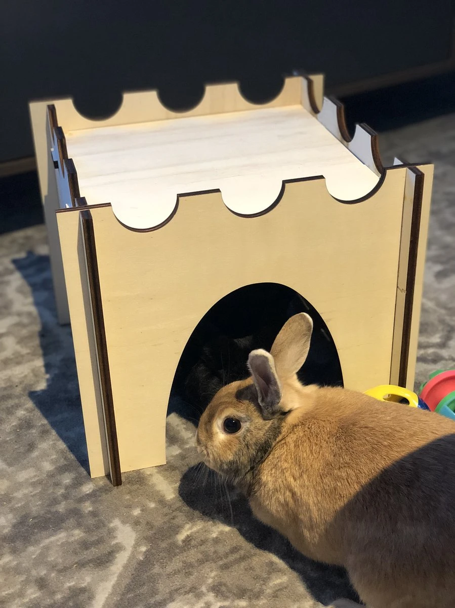 Uniek kasteel voor jou konijn, kat of ander dier. Gemaakt van 9mm multiplex. Eenvoudig in elkaar te zetten. Bestaat uit 5 delen.