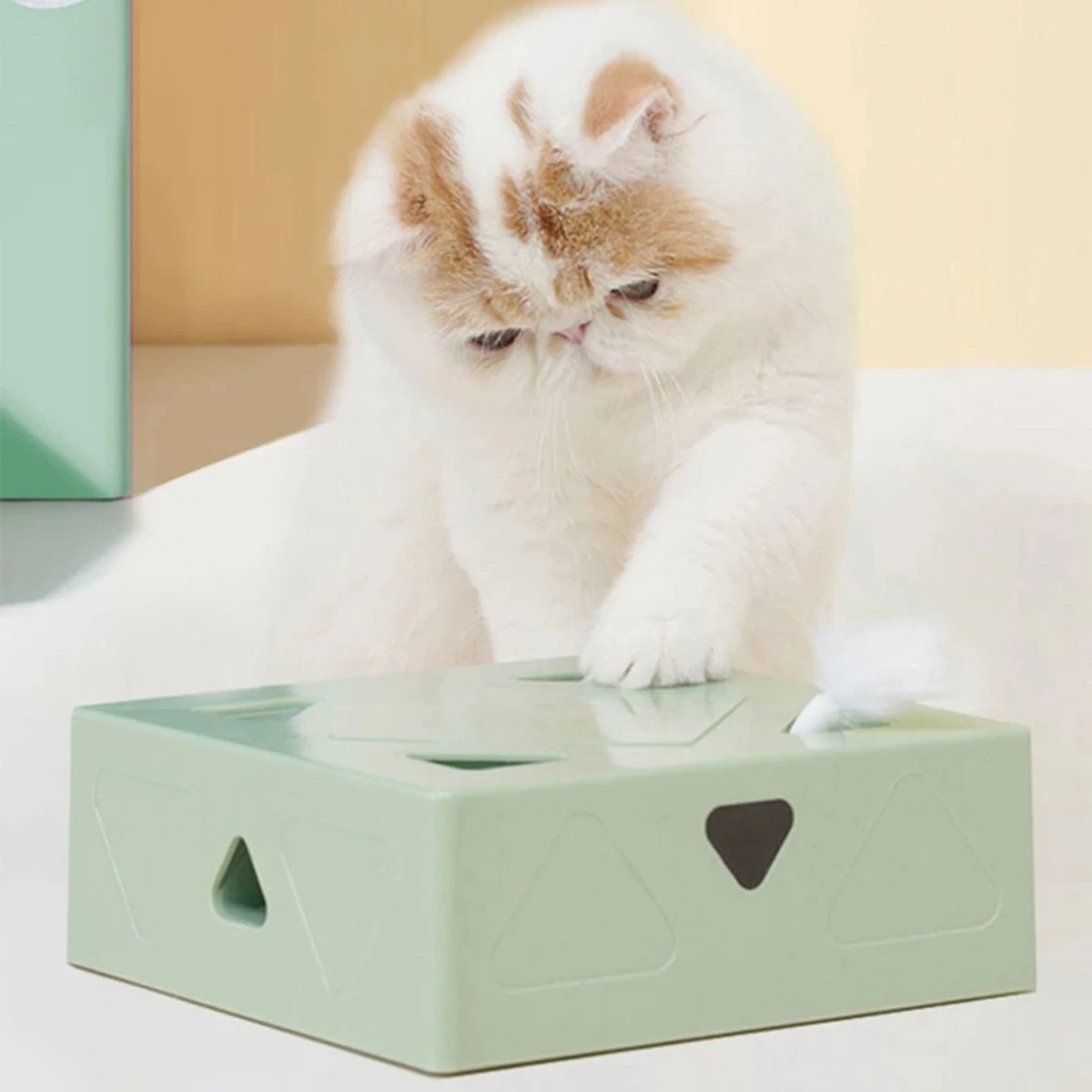 De doos is ontworpen met vijf kanten en zeven gaten, waar veertjes in en uit kunnen bewegen, waardoor het lijkt alsof echte dieren zich verbergen. Dit zorgt ervoor dat uw kat zijn natuurlijke jachtinstincten kan uiten terwijl hij plezier heeft met het zoeken en najagen van de veertjes.